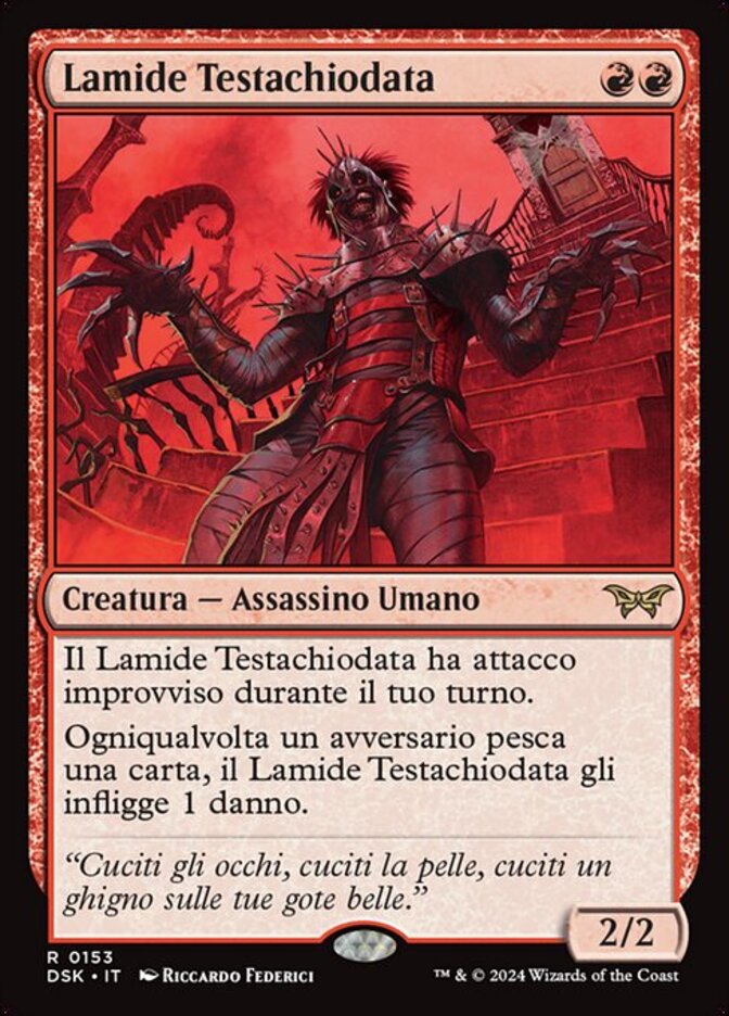 | Rules | Razorkin Needlehead has first strike during your turn. Whenever an opponent draws a card, Razorkin Needlehead deals 1 damage to them. |