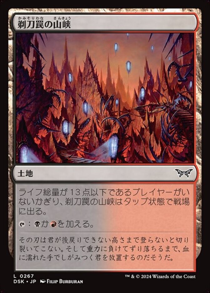 | Rules | Razortrap Gorge enters tapped unless a player has 13 or less life. : Add or . |