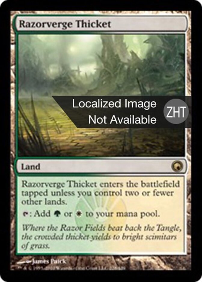 | Rules | Razorverge Thicket enters the battlefield tapped unless you control two or fewer other lands. : Add or . |
