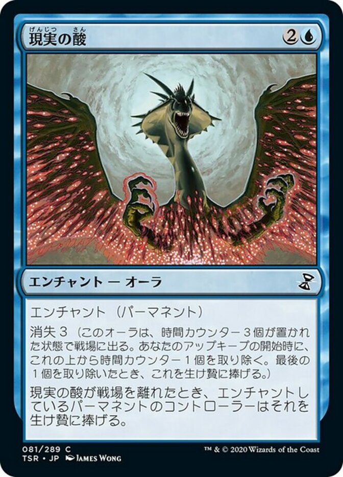| Rules | Enchant permanent Vanishing 3 (This Aura enters the battlefield with three time counters on it. At the beginning of your upkeep, remove a time counter from it. When the last is removed, sacrifice it.) When Reality Acid leaves the battlefield, enchanted permanent's controller sacrifices it. |