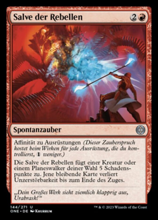 | Rules | Affinity for Equipment (This spell costs less to cast for each Equipment you control.) Rebel Salvo deals 5 damage to target creature or planeswalker. That permanent loses indestructible unil end of turn. |