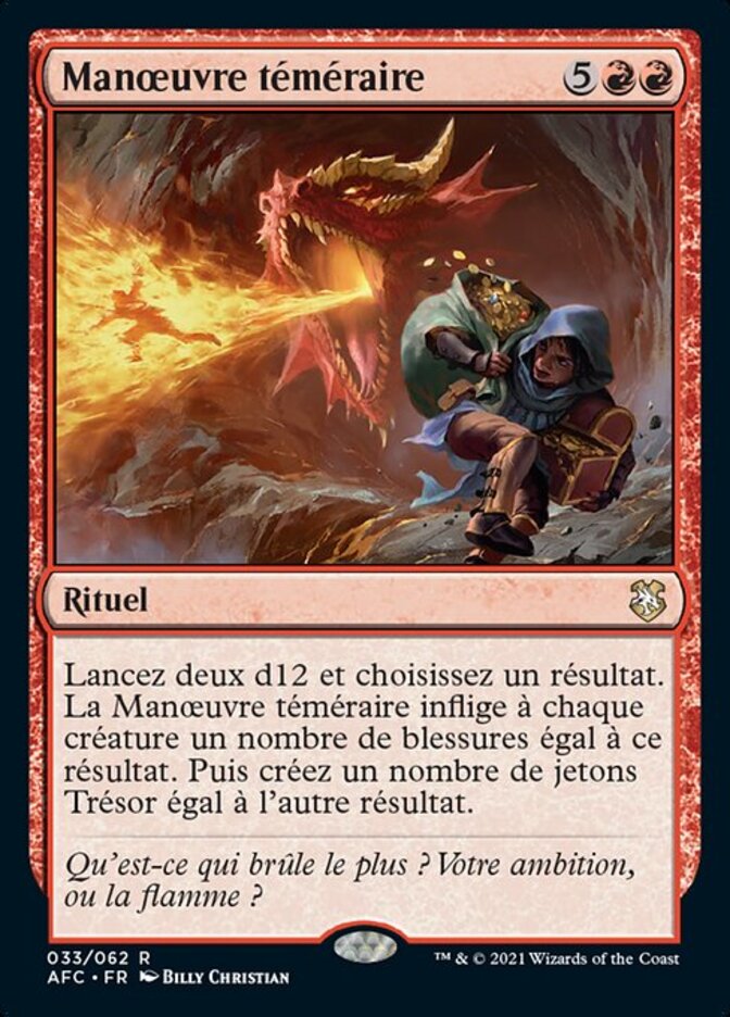 | Rules | Roll two d12 and choose one result. Reckless Endeavor deals damage equal to that result to each creature. Then create a number of Treasure tokens equal to the other result. |