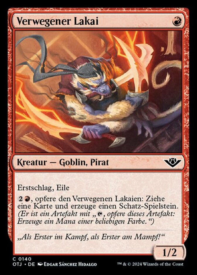 | Rules | First strike, haste , Sacrifice Reckless Lackey: Draw a card and create a Treasure token. (It's an artifact with ", Sacrifice this artifact: Add one mana of any color.") |