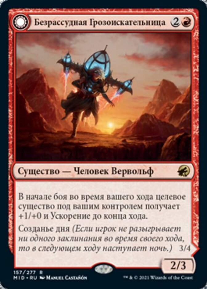 | Rules | At the beginning of combat on your turn, target creature you control gets +1/+0 and gains haste until end of turn. Daybound (If a player casts no spells during their own turn, it becomes night next turn.) // At the beginning of combat on your turn, target creature you control gets +2/+0 and gains trample and haste until end of turn. Nightbound (If a player casts at least two spells during their own turn, it becomes day next turn.) |