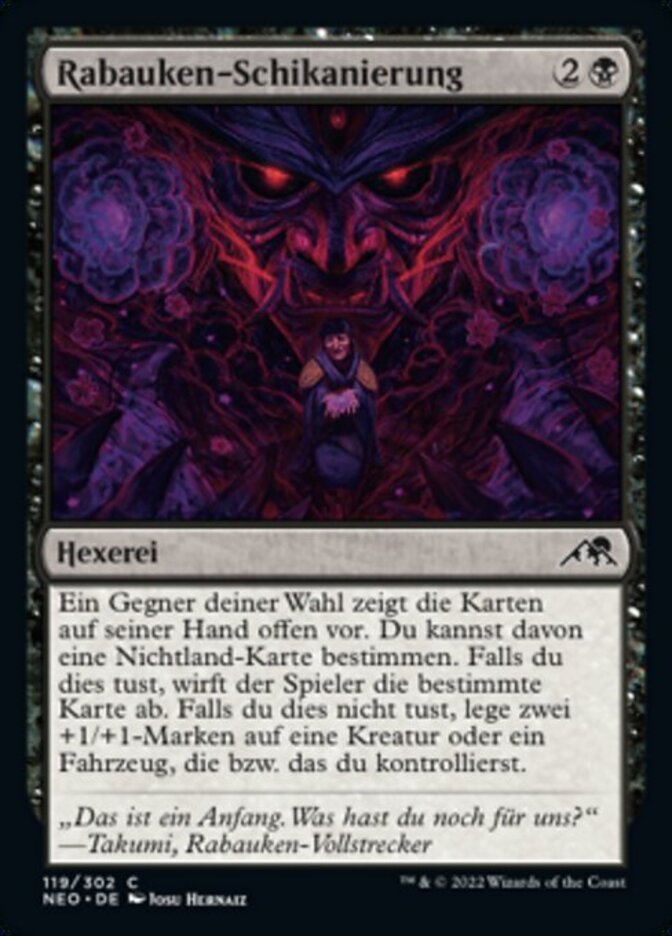 | Rules | Target opponent reveals their hand. You may choose a nonland card from it. If you do, that player discards that card. If you don't, put two +1/+1 counters on a creature or Vehicle you control. |