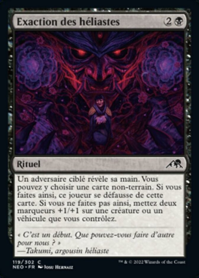 | Rules | Target opponent reveals their hand. You may choose a nonland card from it. If you do, that player discards that card. If you don't, put two +1/+1 counters on a creature or Vehicle you control. |