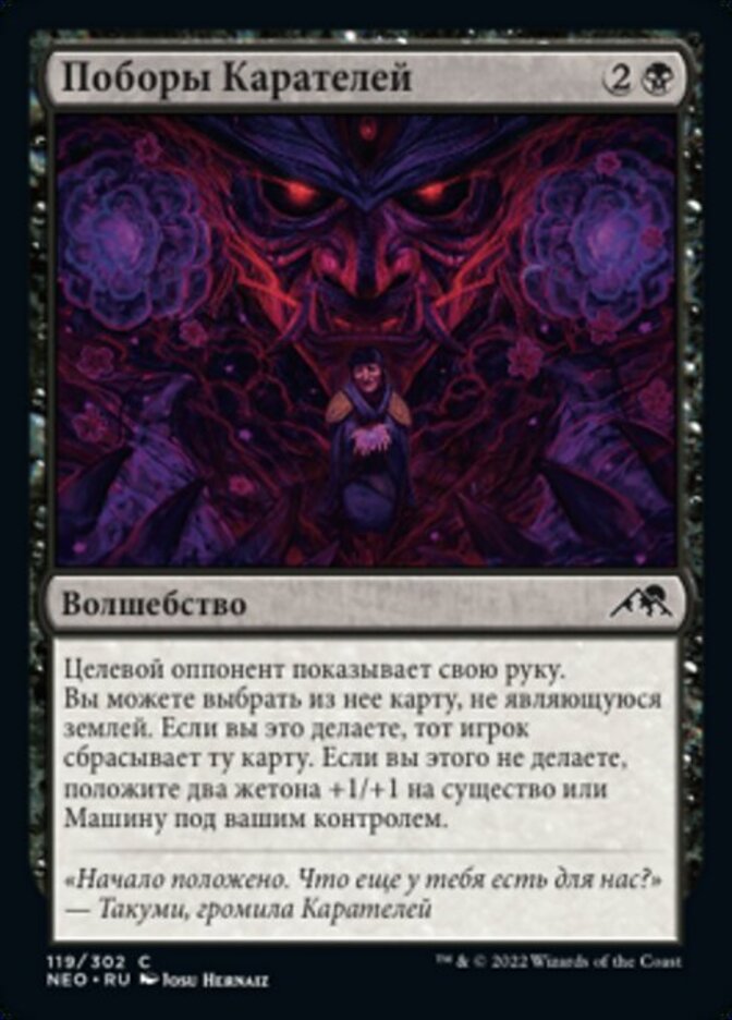 | Rules | Target opponent reveals their hand. You may choose a nonland card from it. If you do, that player discards that card. If you don't, put two +1/+1 counters on a creature or Vehicle you control. |