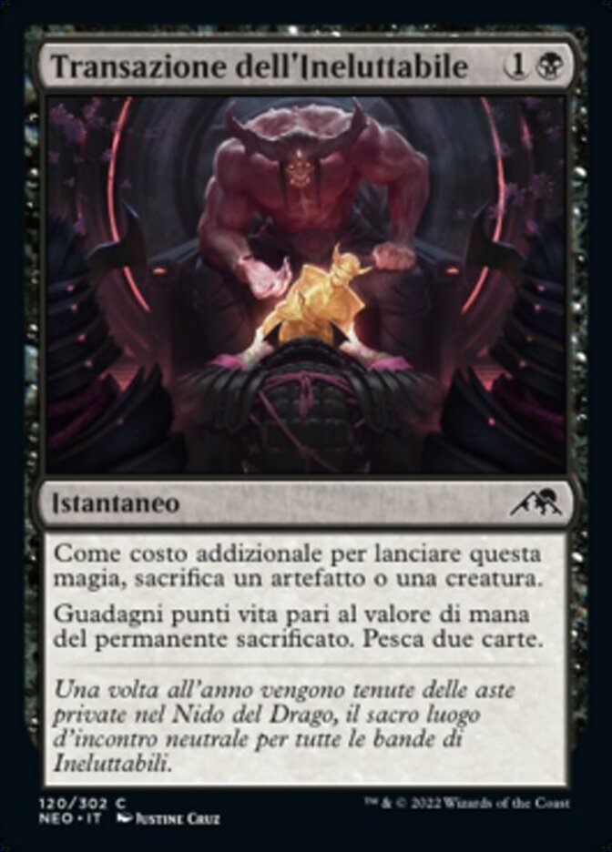 | Rules | As an additional cost to cast this spell, sacrifice an artifact or creature. You gain life equal to the sacrificed permanent's mana value. Draw two cards. |
