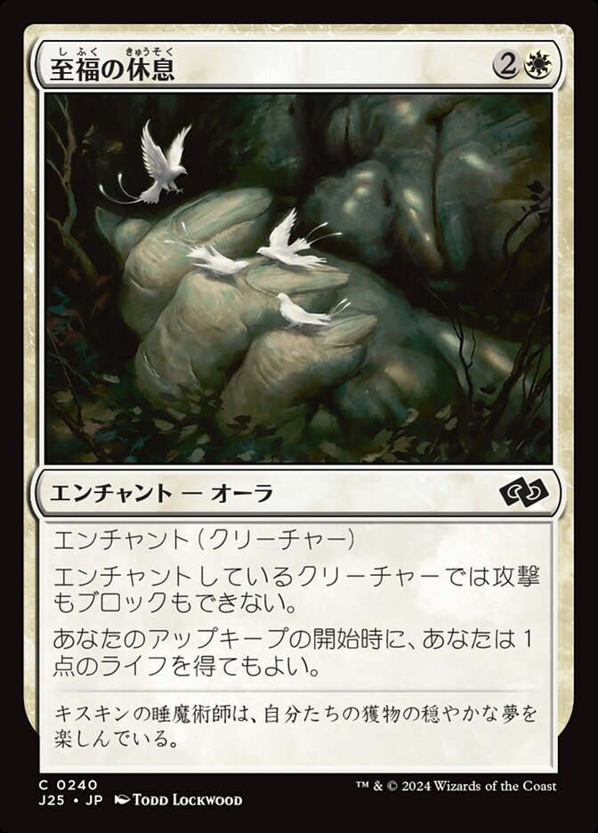 | Rules | Enchant creature Enchanted creature can't attack or block. At the beginning of your upkeep, you may gain 1 life. |