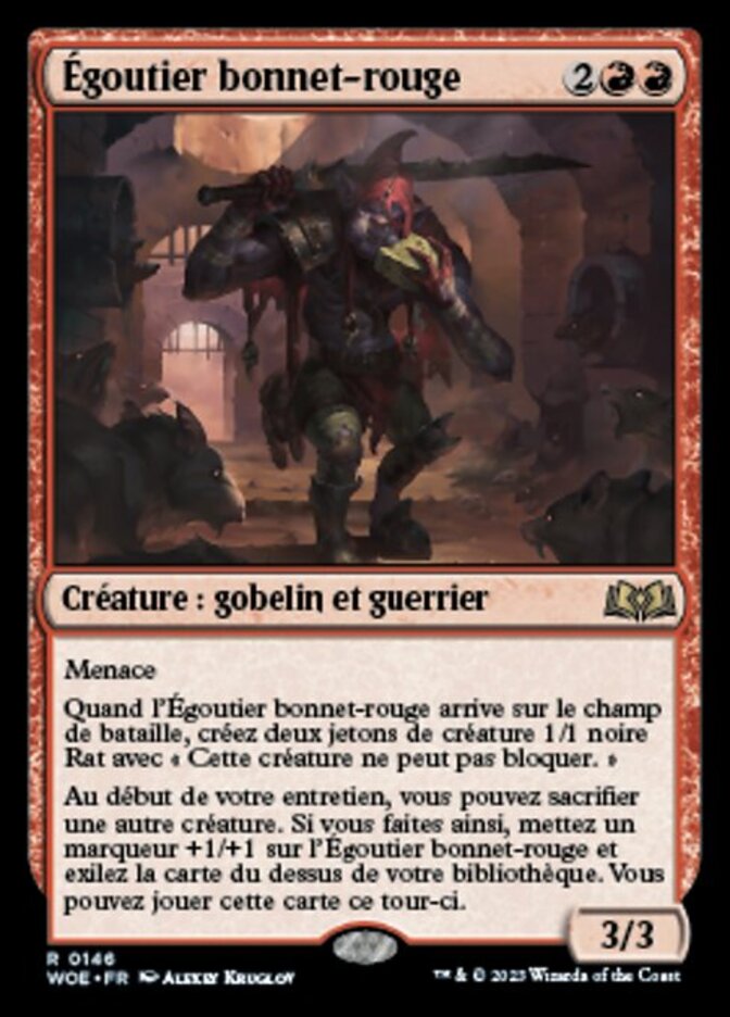 | Rules | Menace When Redcap Gutter-Dweller enters the battlefield, create two 1/1 black Rat creature tokens with "This creature can't block." At the beginning of your upkeep, you may sacrifice another creature. If you do, put a +1/+1 counter on Redcap Gutter-Dweller and exile the top card of your library. You may play that card this turn. |