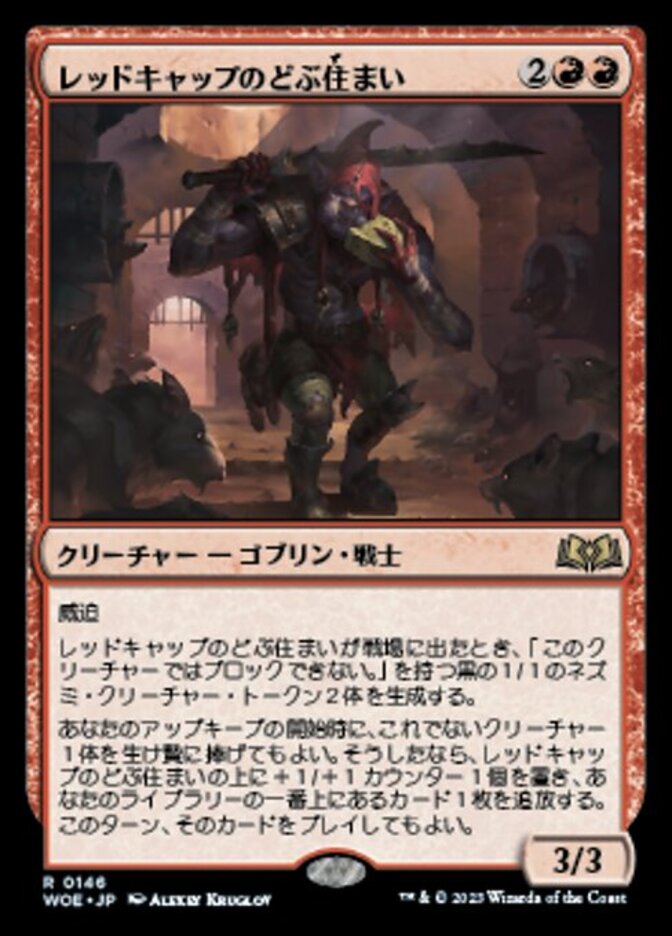 | Rules | Menace When Redcap Gutter-Dweller enters the battlefield, create two 1/1 black Rat creature tokens with "This creature can't block." At the beginning of your upkeep, you may sacrifice another creature. If you do, put a +1/+1 counter on Redcap Gutter-Dweller and exile the top card of your library. You may play that card this turn. |