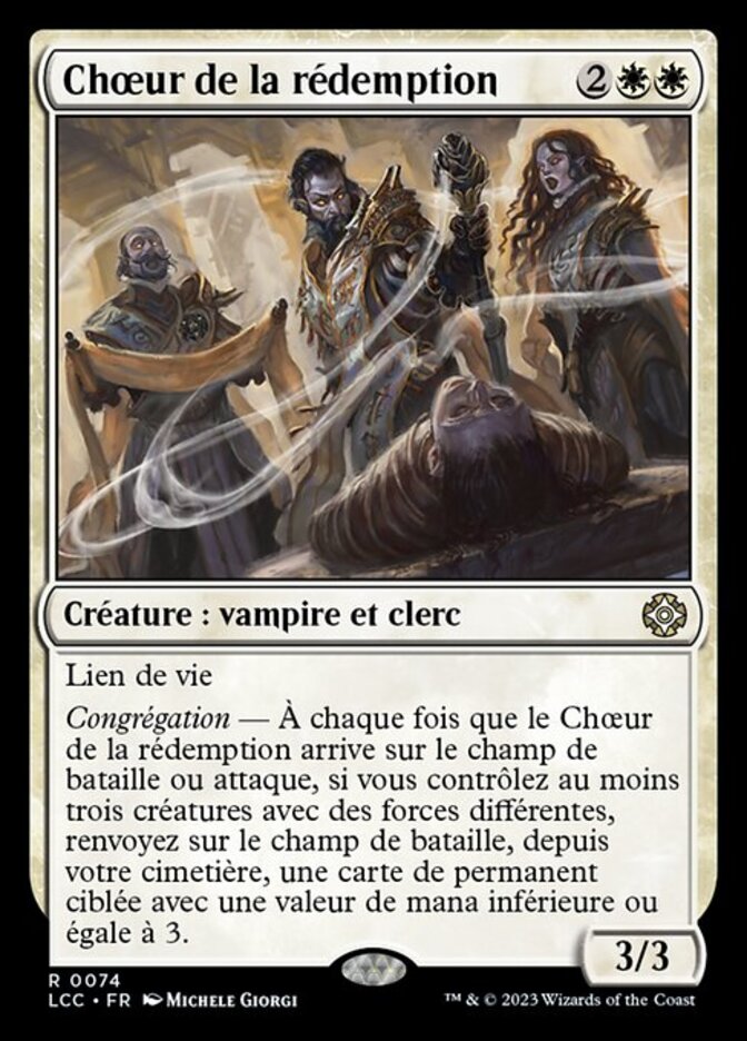 | Rules | Lifelink Coven — Whenever Redemption Choir enters the battlefield or attacks, if you control three or more creatures with different powers, return target permanent card with mana value 3 or less from your graveyard to the battlefield. |