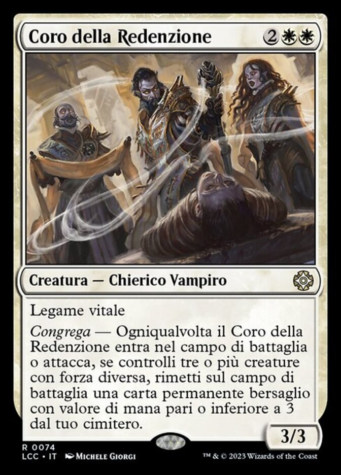 | Rules | Lifelink Coven — Whenever Redemption Choir enters the battlefield or attacks, if you control three or more creatures with different powers, return target permanent card with mana value 3 or less from your graveyard to the battlefield. |