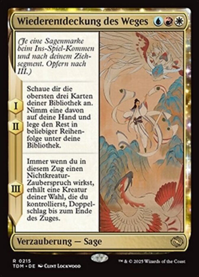 | Rules | (As this Saga enters and after your draw step, add a lore counter. Sacrifice after III.) I, II — Look at the top three cards of your library. Put one of them into your hand and the rest on the bottom of your library in any order. III — Whenever you cast a noncreature spell this turn, target creature you control gains double strike until end of turn. |