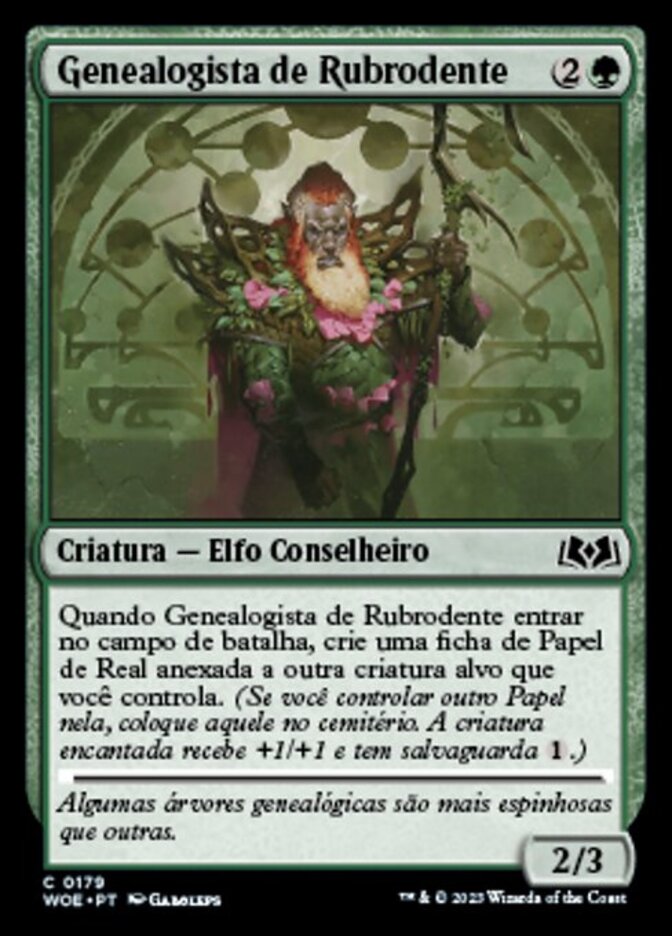 | Rules | When Redtooth Genealogist enters the battlefield, create a Royal Role token attached to another target creature you control. (If you control another Role on it, put that one into the graveyard. Enchanted creature gets +1/+1 and has ward .) |