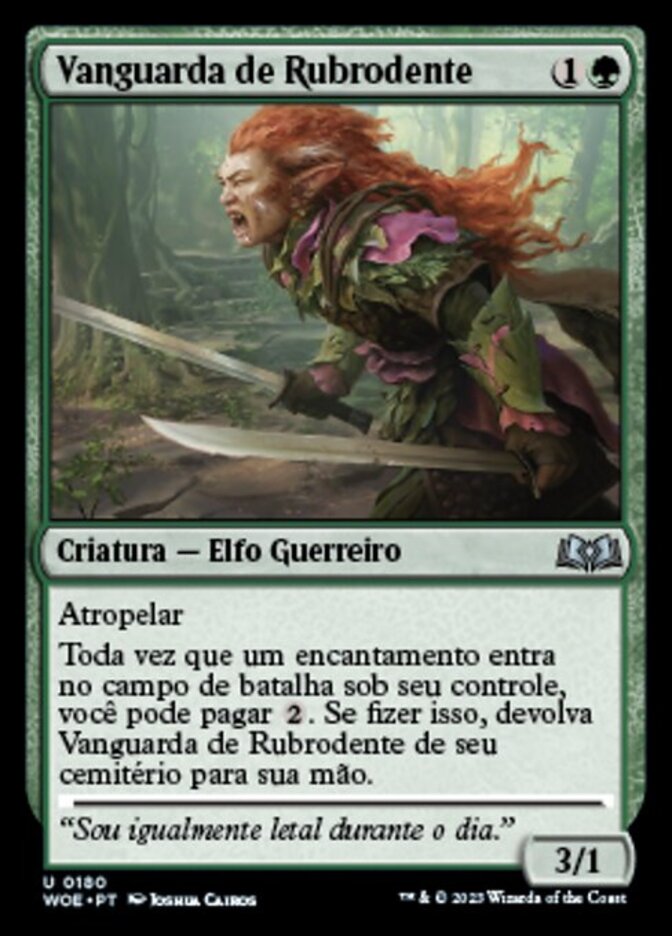 | Rules | Trample Whenever an enchantment enters the battlefield under your control, you may pay . If you do, return Redtooth Vanguard from your graveyard to your hand. |