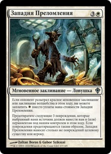 | Rules | If an opponent cast a red instant or sorcery spell this turn, you may pay rather than pay this spell's mana cost. Prevent the next 3 damage that a source of your choice would deal to you and/or permanents you control this turn. If damage is prevented this way, Refraction Trap deals that much damage to any target. |