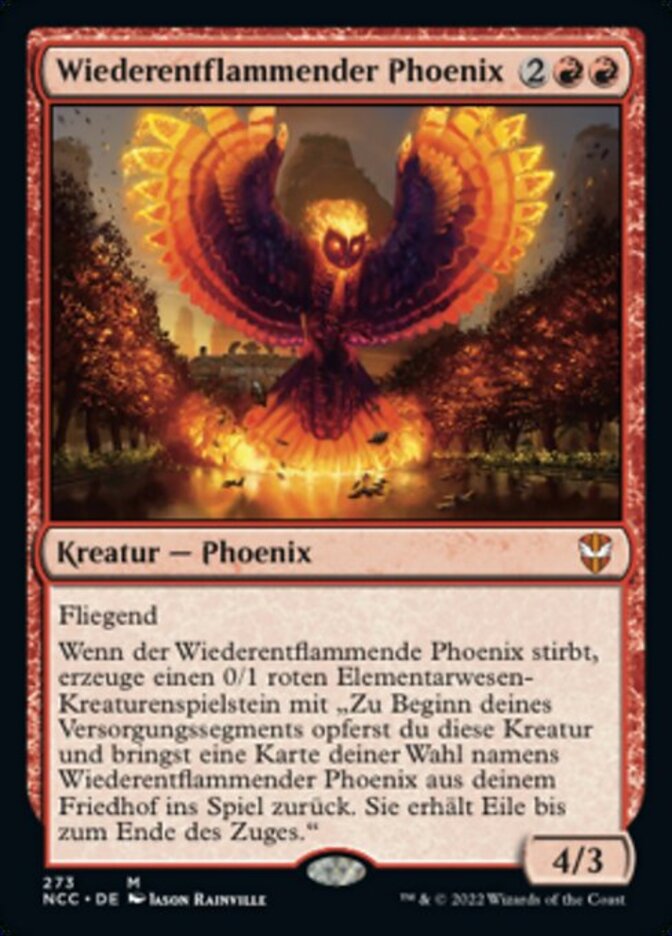 | Rules | Flying When Rekindling Phoenix dies, create a 0/1 red Elemental creature token with "At the beginning of your upkeep, sacrifice this creature and return target card named Rekindling Phoenix from your graveyard to the battlefield. It gains haste until end of turn." |