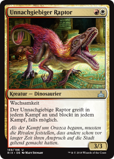 | Rules | Vigilance Relentless Raptor attacks or blocks each combat if able. |