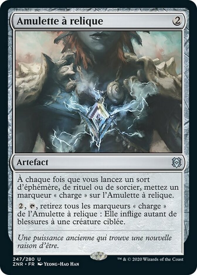 | Rules | Whenever you cast an instant, sorcery, or Wizard spell, put a charge counter on Relic Amulet. , , Remove all charge counters from Relic Amulet: It deals that much damage to target creature. |
