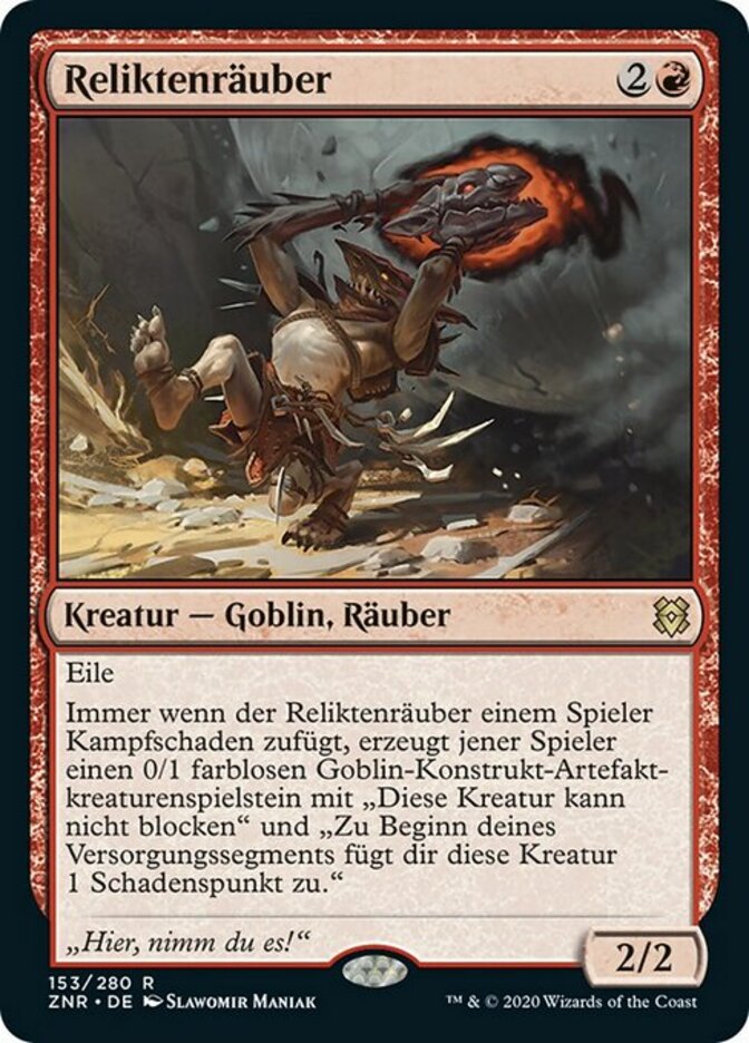 | Rules | Haste Whenever Relic Robber deals combat damage to a player, that player creates a 0/1 colorless Goblin Construct artifact creature token with "This creature can't block" and "At the beginning of your upkeep, this creature deals 1 damage to you." |