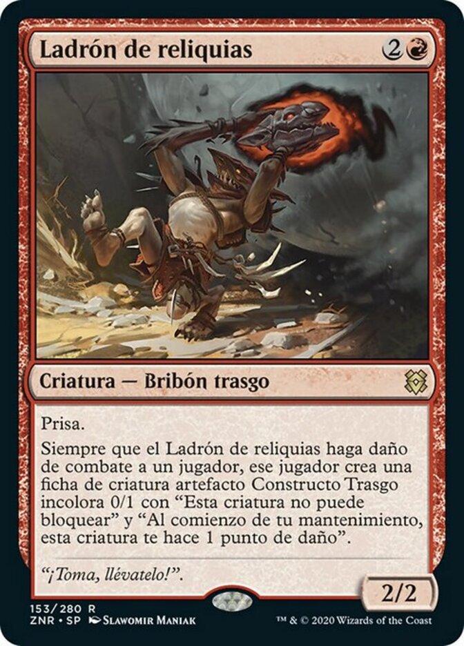 | Rules | Haste Whenever Relic Robber deals combat damage to a player, that player creates a 0/1 colorless Goblin Construct artifact creature token with "This creature can't block" and "At the beginning of your upkeep, this creature deals 1 damage to you." |