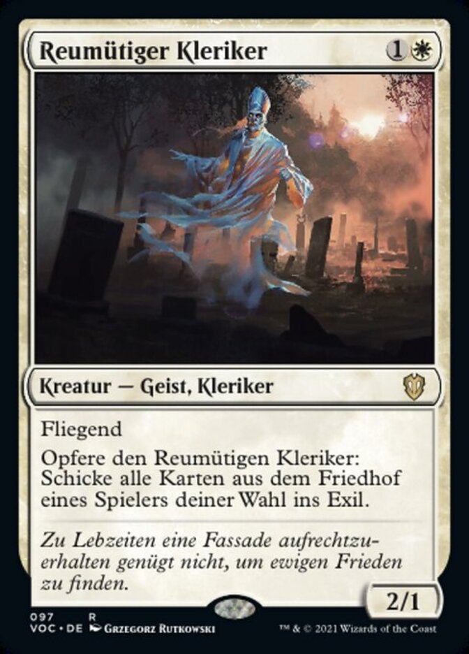 | Rules | Flying Sacrifice Remorseful Cleric: Exile target player's graveyard. |