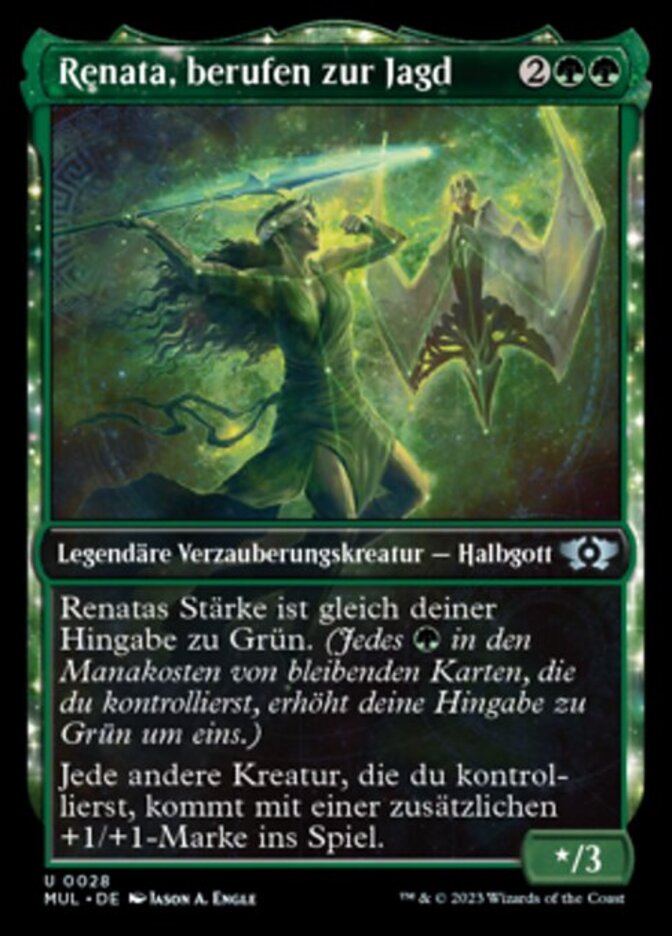 | Rules | Renata's power is equal to your devotion to green. (Each in the mana costs of permanents you control counts toward your devotion to green.) Each other creature you control enters the battlefield with an additional +1/+1 counter on it. |