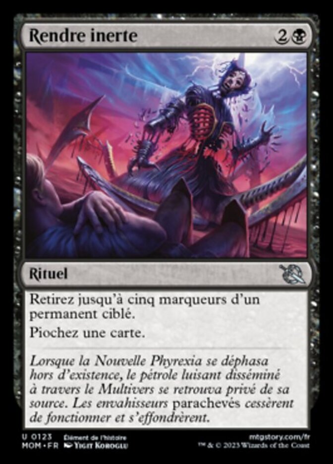| Flavor | As New Phyrexia phased out of existence, glistening oil all across the Multiverse was cut off from its source. The *compleated* invaders ceased to function and crumpled to the ground. |