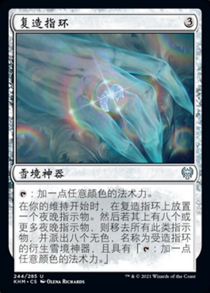 | Rules | : Add one mana of any color. At the beginning of your upkeep, put a night counter on Replicating Ring. Then if it has eight or more night counters on it, remove all of them and create eight colorless snow artifact tokens named Replicated Ring with ": Add one mana of any color." |