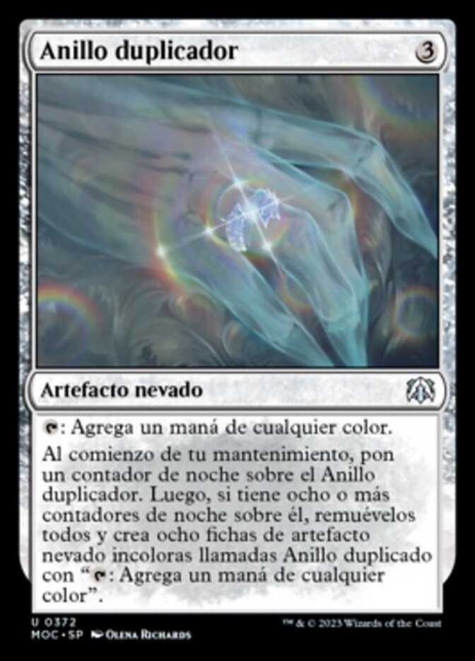 | Rules | : Add one mana of any color. At the beginning of your upkeep, put a night counter on Replicating Ring. Then if it has eight or more night counters on it, remove all of them and create eight colorless snow artifact tokens named Replicated Ring with ": Add one mana of any color." |