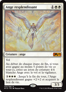 | Rules | Flying At the beginning of each end step, if you gained 5 or more life this turn, create a 4/4 white Angel creature token with flying and vigilance. : Until end of turn, Resplendent Angel gets +2/+2 and gains lifelink. |