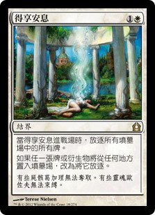 | Rules | When Rest in Peace enters the battlefield, exile all graveyards. If a card or token would be put into a graveyard from anywhere, exile it instead. |