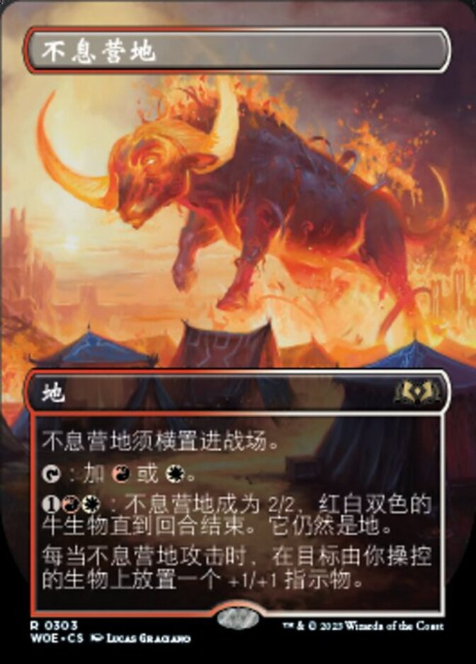 | Rules | Restless Bivouac enters the battlefield tapped. : Add or . : Restless Bivouac becomes a 2/2 red and white Ox creature until end of turn. It's still a land. Whenever Restless Bivouac attacks, put a +1/+1 counter on target creature you control. |