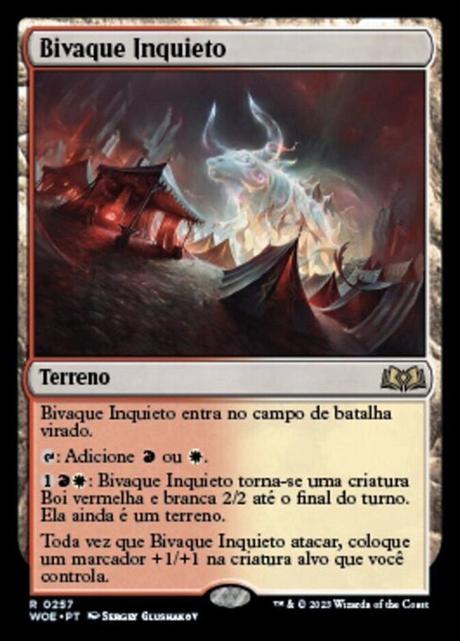 | Rules | Restless Bivouac enters the battlefield tapped. : Add or . : Restless Bivouac becomes a 2/2 red and white Ox creature until end of turn. It's still a land. Whenever Restless Bivouac attacks, put a +1/+1 counter on target creature you control. |