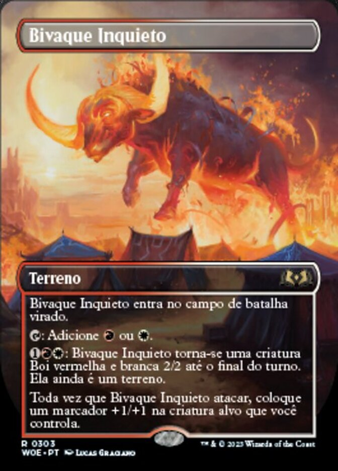 | Rules | Restless Bivouac enters the battlefield tapped. : Add or . : Restless Bivouac becomes a 2/2 red and white Ox creature until end of turn. It's still a land. Whenever Restless Bivouac attacks, put a +1/+1 counter on target creature you control. |