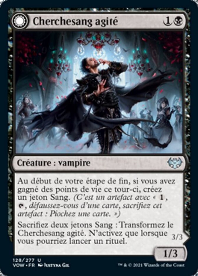 | Rules | At the beginning of your end step, if you gained life this turn, create a Blood token. (It's an artifact with ", , Discard a card, Sacrifice this artifact: Draw a card.") Sacrifice two Blood tokens: Transform Restless Bloodseeker. Activate only as a sorcery. // At the beginning of your end step, if you gained life this turn, create a Blood token. (It's an artifact with ", , Discard a card, Sacrifice this artifact: Draw a card.") : Each opponent loses 2 life and you gain 2 life. |