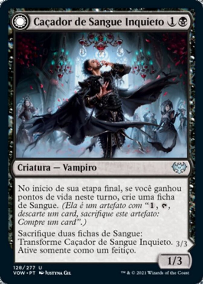 | Rules | At the beginning of your end step, if you gained life this turn, create a Blood token. (It's an artifact with ", , Discard a card, Sacrifice this artifact: Draw a card.") Sacrifice two Blood tokens: Transform Restless Bloodseeker. Activate only as a sorcery. // At the beginning of your end step, if you gained life this turn, create a Blood token. (It's an artifact with ", , Discard a card, Sacrifice this artifact: Draw a card.") : Each opponent loses 2 life and you gain 2 life. |