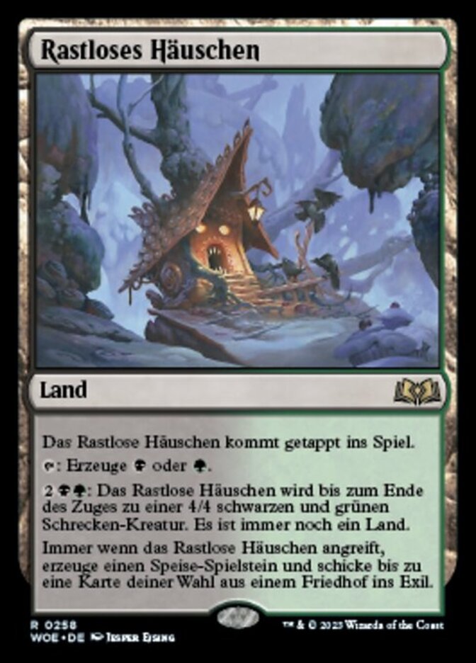 | Rules | Restless Cottage enters the battlefield tapped. : Add or . : Restless Cottage becomes a 4/4 black and green Horror creature until end of turn. It's still a land. Whenever Restless Cottage attacks, create a Food token and exile up to one target card from a graveyard. |