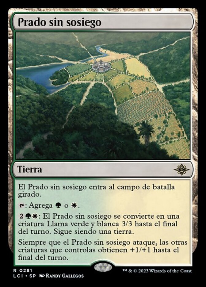 | Rules | Restless Prairie enters the battlefield tapped. : Add or . : Restless Prairie becomes a 3/3 green and white Llama creature until end of turn. It's still a land. Whenever Restless Prairie attacks, other creatures you control get +1/+1 until end of turn. |