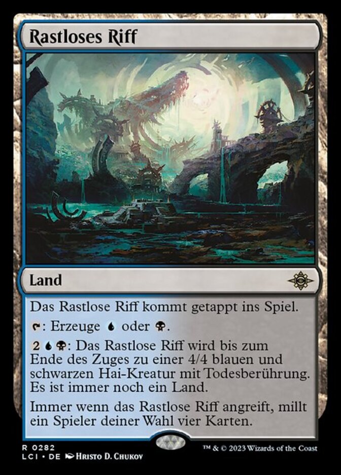 | Rules | Restless Reef enters the battlefield tapped. : Add or . : Until end of turn, Restless Reef becomes a 4/4 blue and black Shark creature with deathtouch. It's still a land. Whenever Restless Reef attacks, target player mills four cards. |
