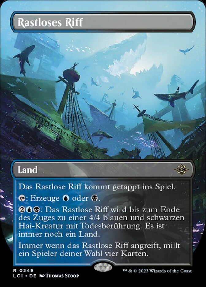 | Rules | Restless Reef enters the battlefield tapped. : Add or . : Until end of turn, Restless Reef becomes a 4/4 blue and black Shark creature with deathtouch. It's still a land. Whenever Restless Reef attacks, target player mills four cards. |