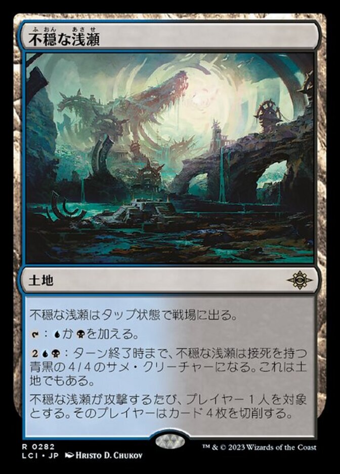 | Rules | Restless Reef enters the battlefield tapped. : Add or . : Until end of turn, Restless Reef becomes a 4/4 blue and black Shark creature with deathtouch. It's still a land. Whenever Restless Reef attacks, target player mills four cards. |
