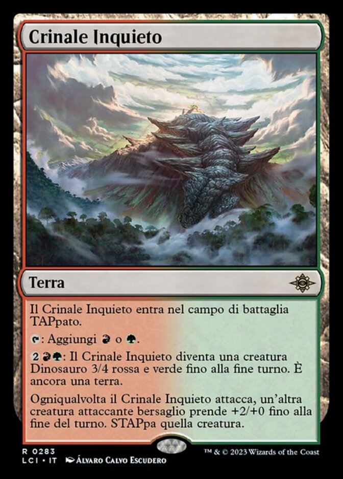 | Rules | Restless Ridgeline enters the battlefield tapped. : Add or . : Restless Ridgeline becomes a 3/4 red and green Dinosaur creature until end of turn. It's still a land. Whenever Restless Ridgeline attacks, another target attacking creature gets +2/+0 until end of turn. Untap that creature. |
