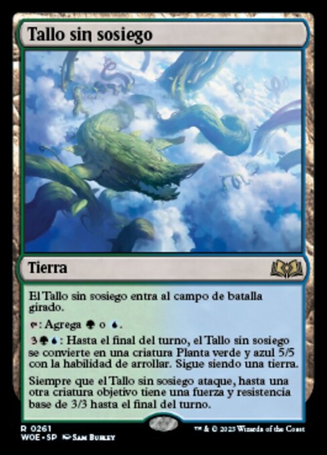 | Rules | Restless Vinestalk enters the battlefield tapped. : Add or . : Until end of turn, Restless Vinestalk becomes a 5/5 green and blue Plant creature with trample. It's still a land. Whenever Restless Vinestalk attacks, up to one other target creature has base power and toughness 3/3 until end of turn. |