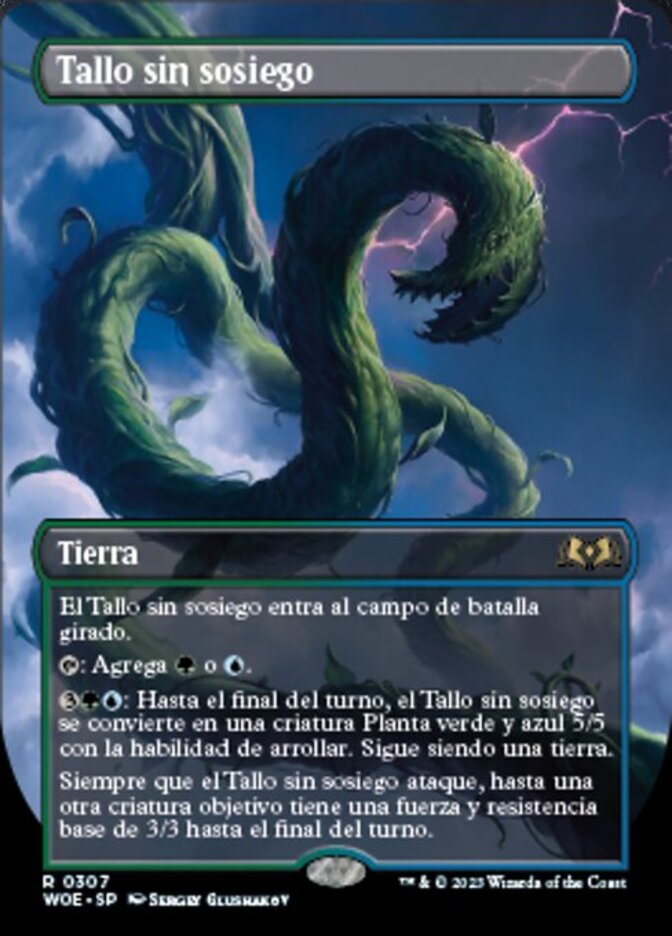 | Rules | Restless Vinestalk enters the battlefield tapped. : Add or . : Until end of turn, Restless Vinestalk becomes a 5/5 green and blue Plant creature with trample. It's still a land. Whenever Restless Vinestalk attacks, up to one other target creature has base power and toughness 3/3 until end of turn. |