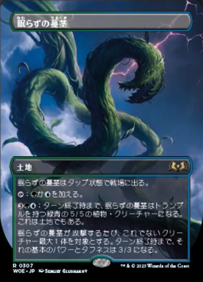 | Rules | Restless Vinestalk enters the battlefield tapped. : Add or . : Until end of turn, Restless Vinestalk becomes a 5/5 green and blue Plant creature with trample. It's still a land. Whenever Restless Vinestalk attacks, up to one other target creature has base power and toughness 3/3 until end of turn. |