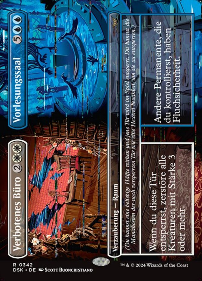 | Rules | (You may cast either half. That door unlocks on the battlefield. As a sorcery, you may pay the mana cost of a locked door to unlock it.) When you unlock this door, destroy all creatures with power 3 or greater. // (You may cast either half. That door unlocks on the battlefield. As a sorcery, you may pay the mana cost of a locked door to unlock it.) Other permanents you control have hexproof. |