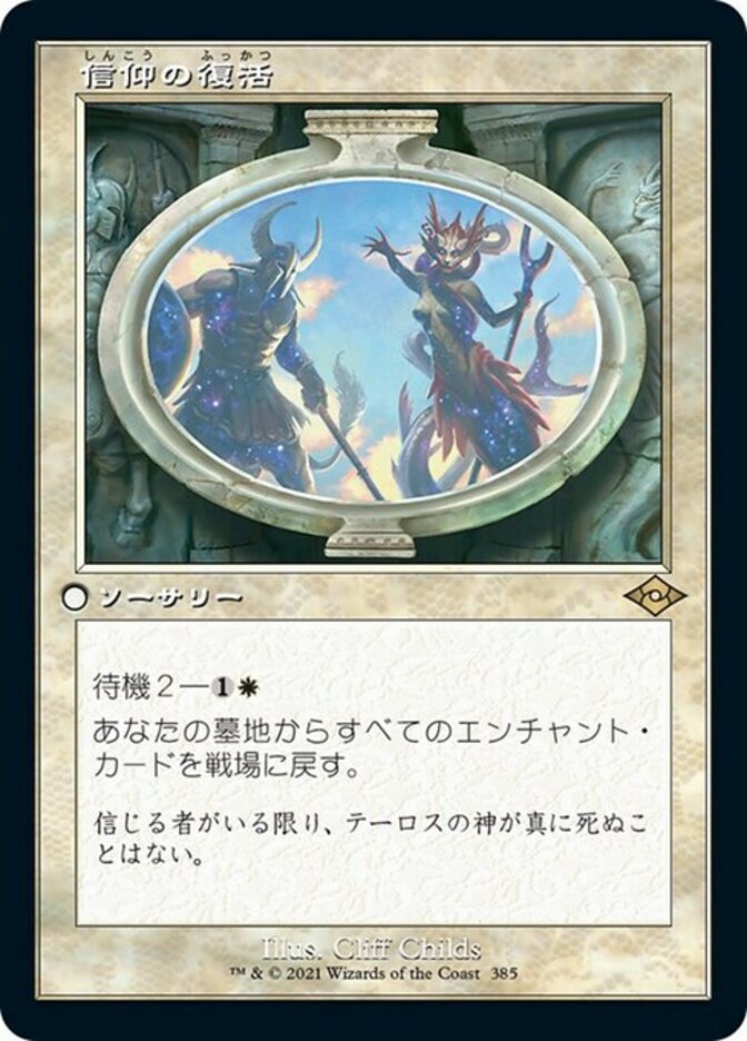 | Rules | Suspend 2— (Rather than cast this card from your hand, pay and exile it with two time counters on it. At the beginning of your upkeep, remove a time counter. When the last is removed, cast it without paying its mana cost.) Return all enchantment cards from your graveyard to the battlefield. (Auras with nothing to enchant remain in your graveyard.) |