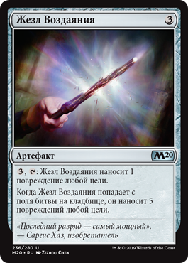 | Rules | , : Retributive Wand deals 1 damage to any target. When Retributive Wand is put into a graveyard from the battlefield, it deals 5 damage to any target. |